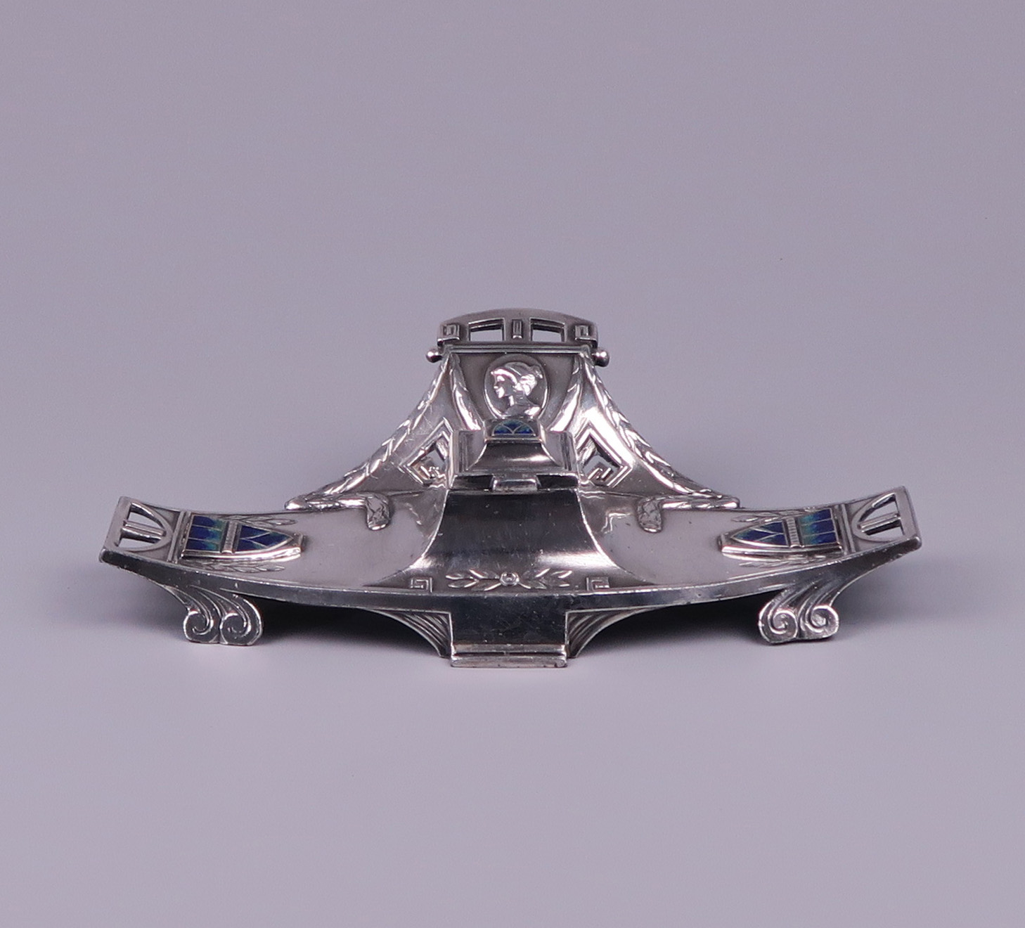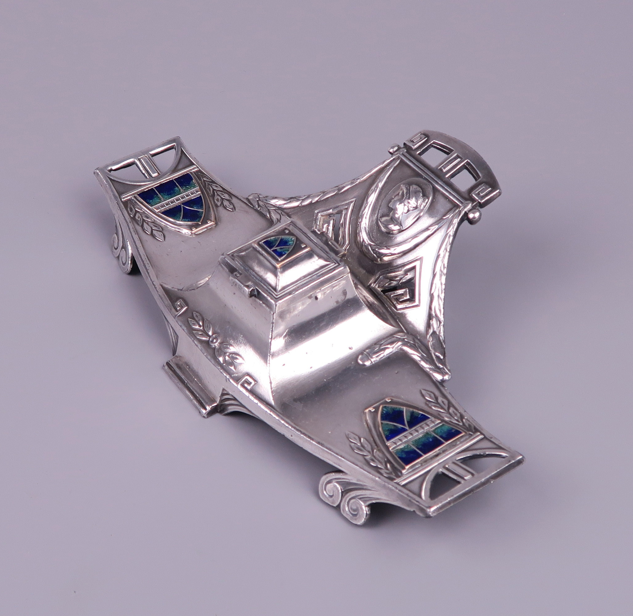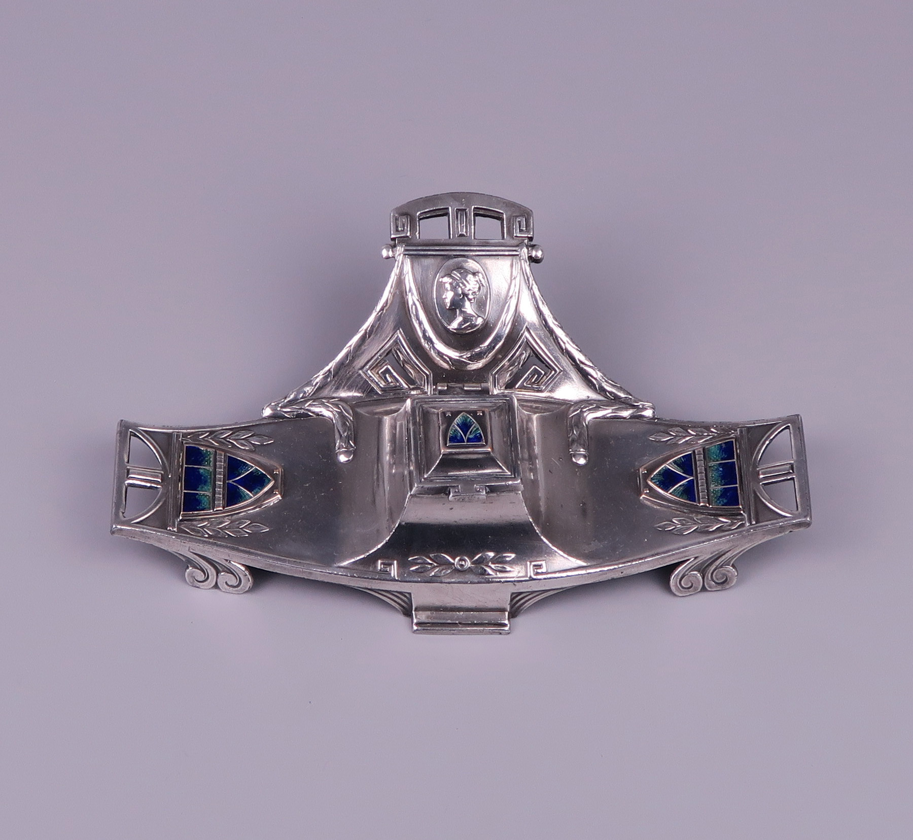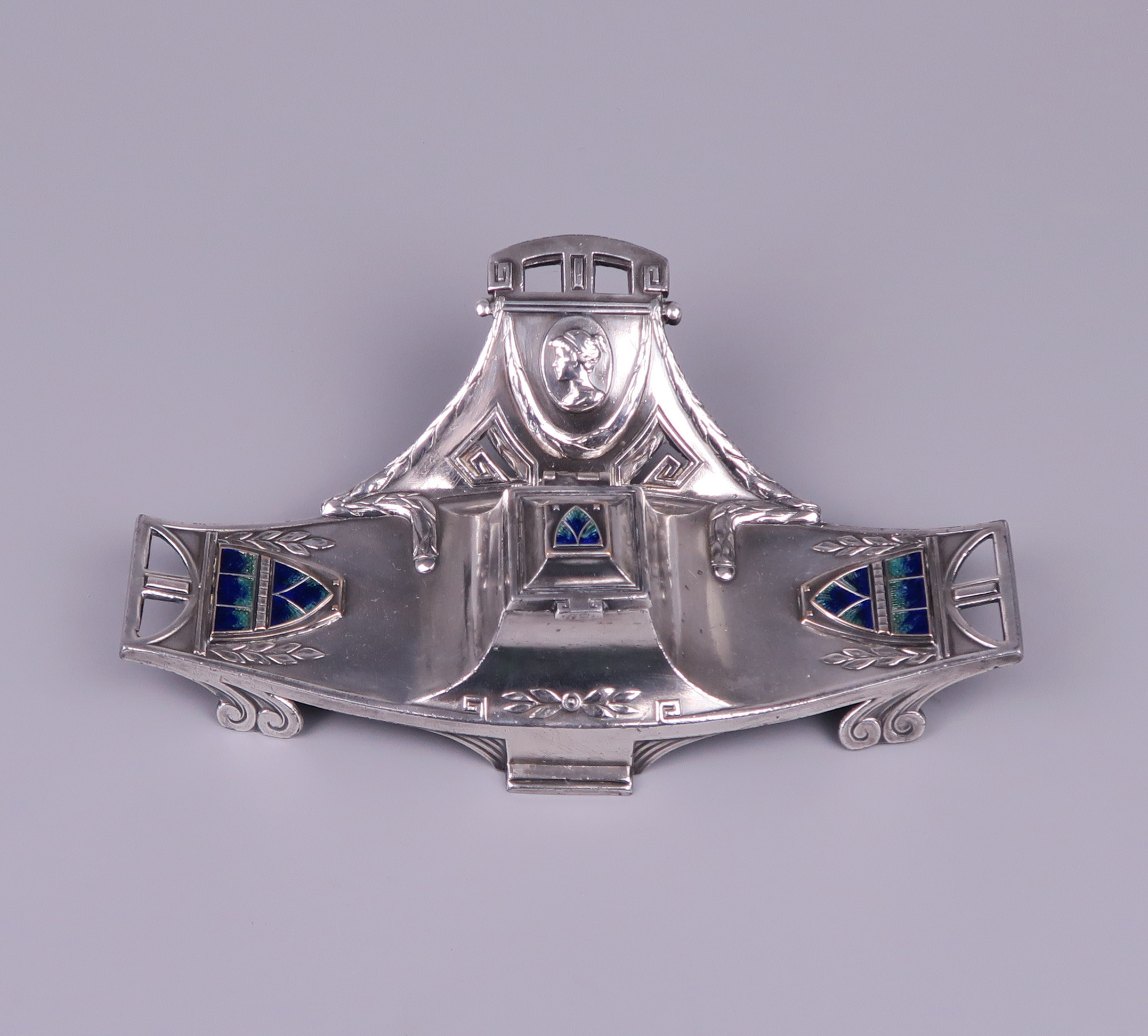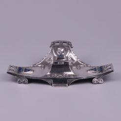 A Vienna Secession inkstand – inkwell, silver plated pewter with enameled plaques circa 1900.