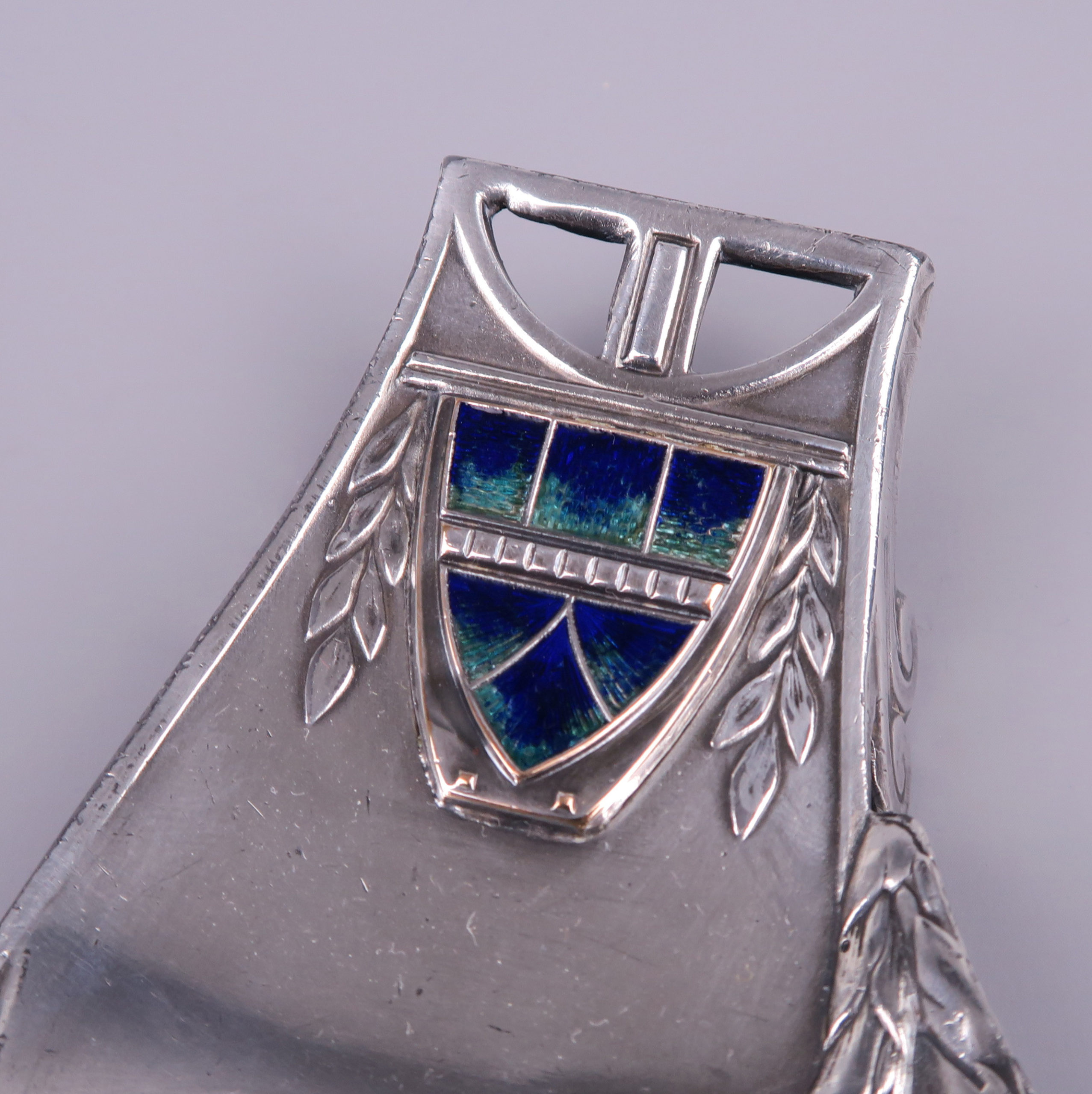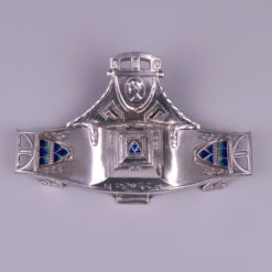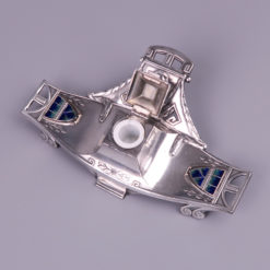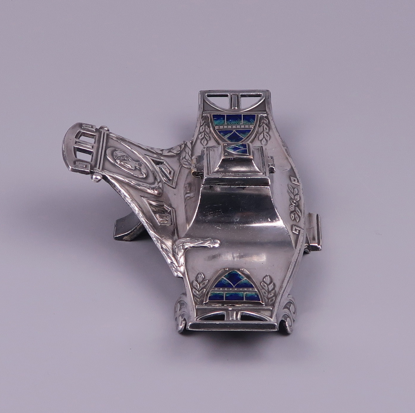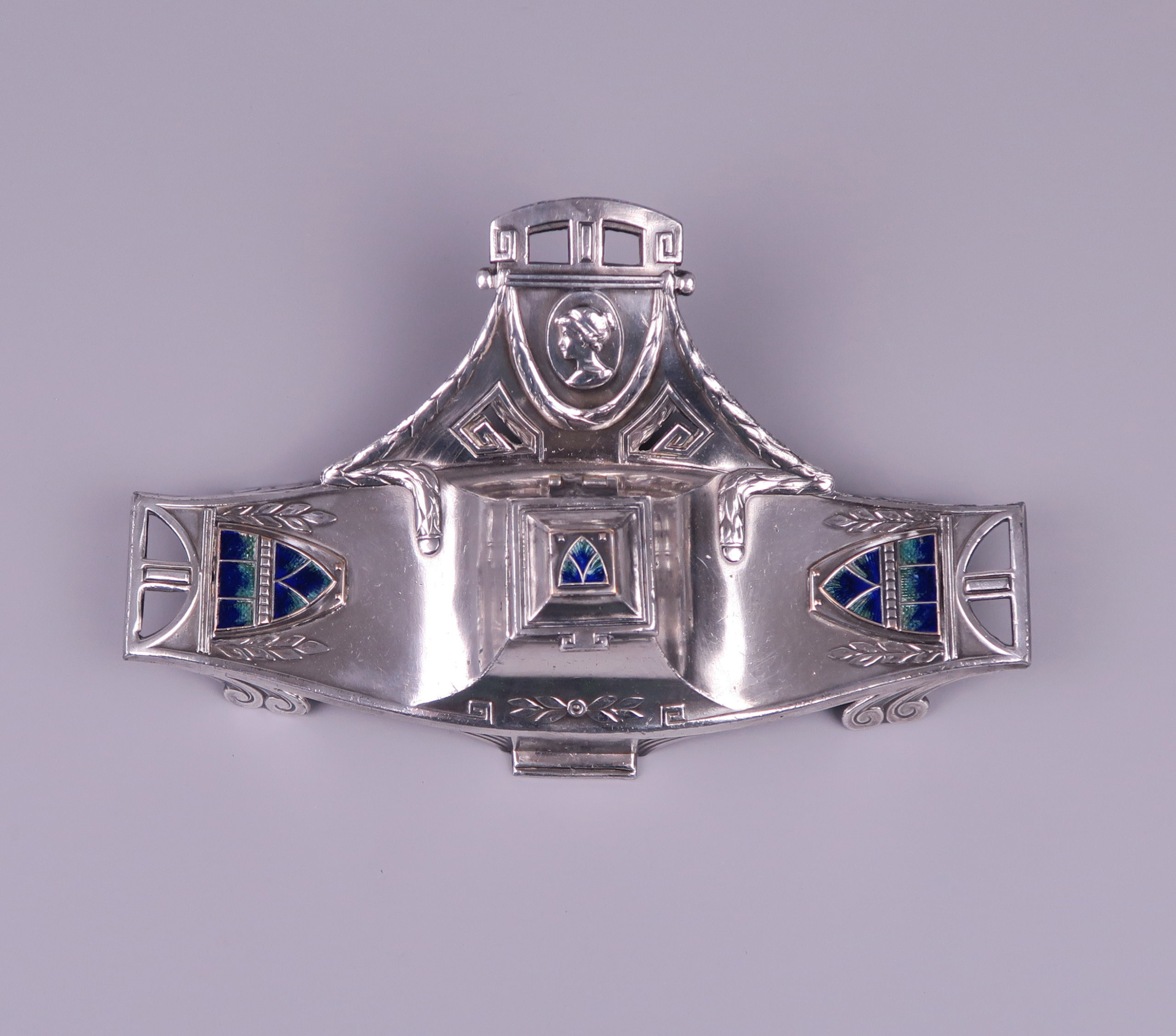 A Vienna Secession inkstand – inkwell, silver plated pewter with enameled plaques circa 1900.